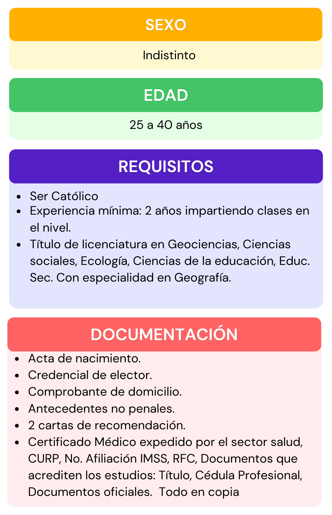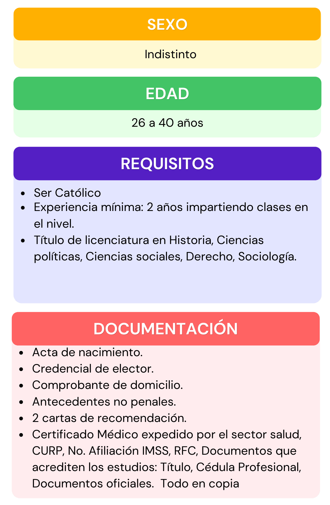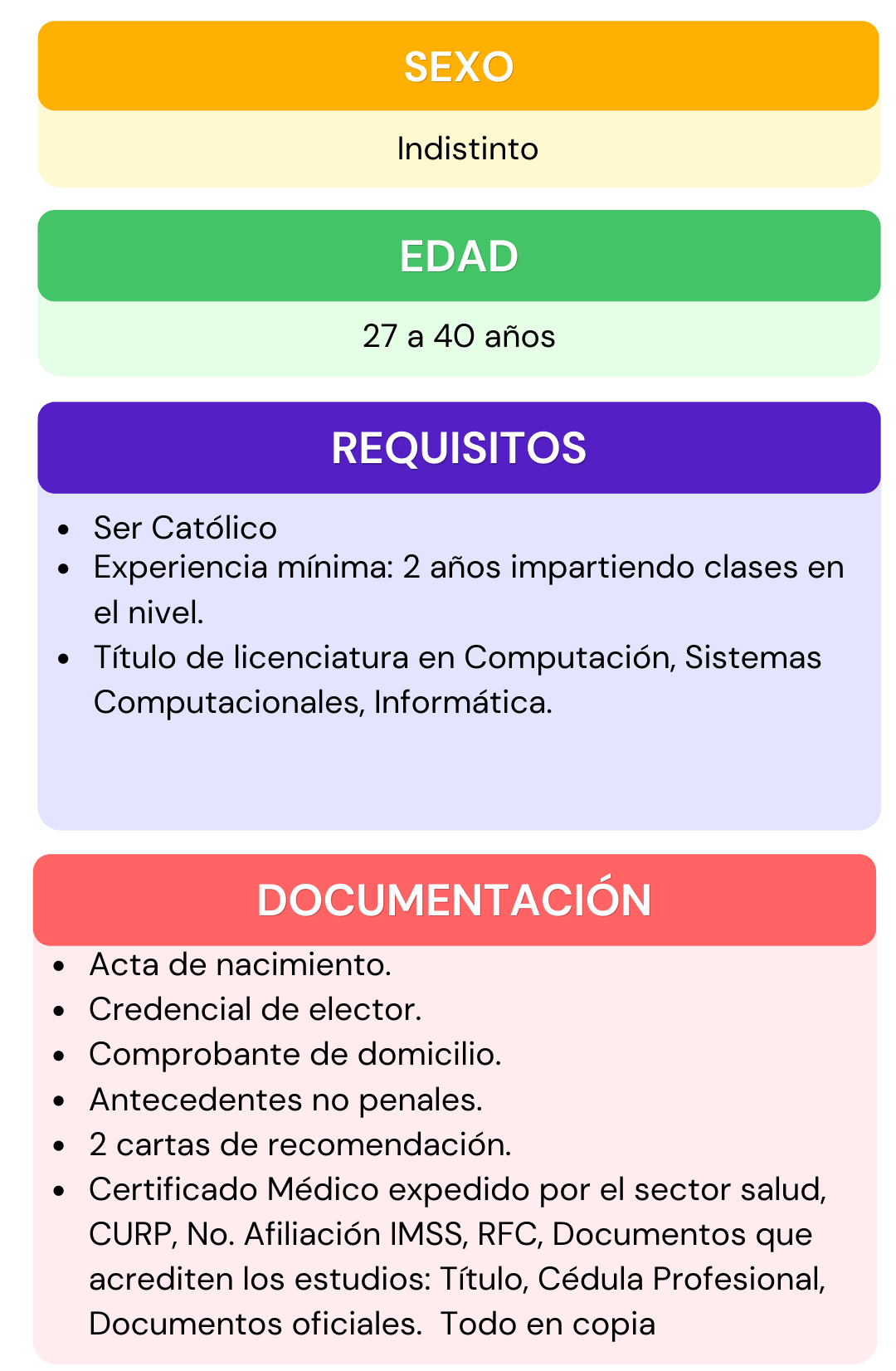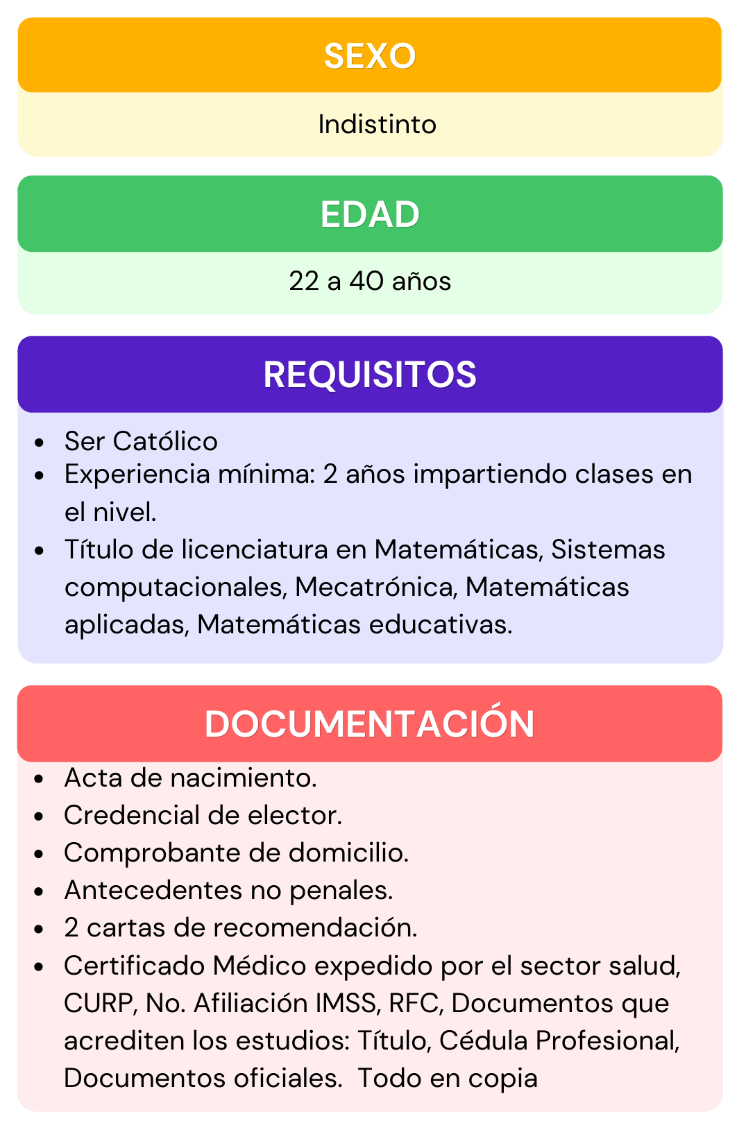 Si deseas formar parte del personal que labora en nuestra institución, selecciona el área de interés para la cual te gustaría aplicar, da click en ver requisitos ahí encontraras todos los requisitos que se ocupan para el puesto seleccionado, después abre el chat que se encuentra en la parte inferior izquierda, escribe el puesto de interés y rellena los datos que se te piden, por ultimo adjunta tu currículum vitae. En caso de contar con alguna vacante nos pondremos en contacto contigo.