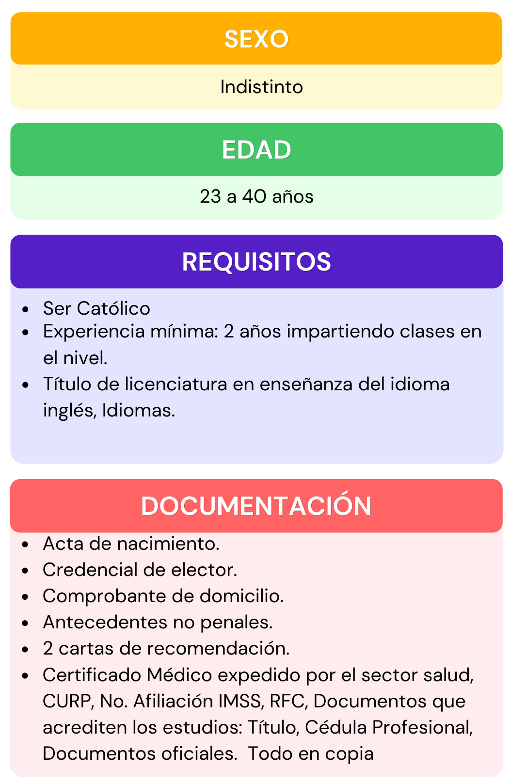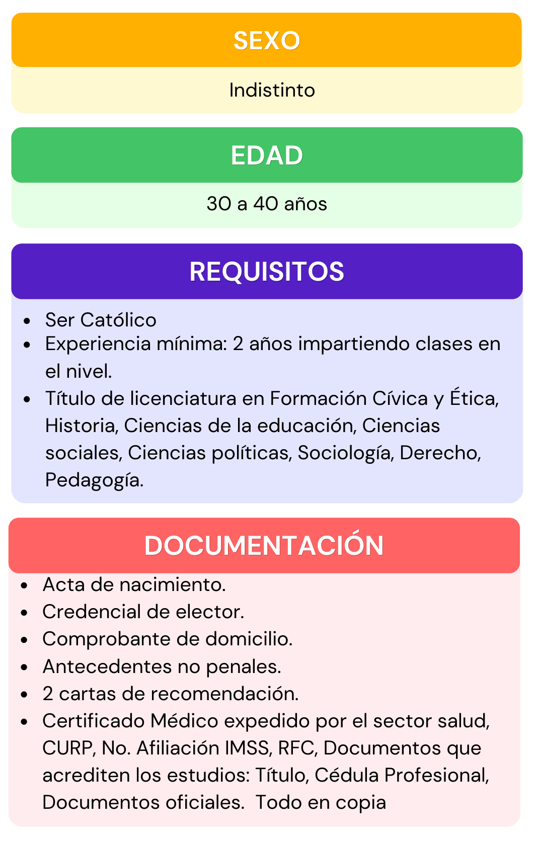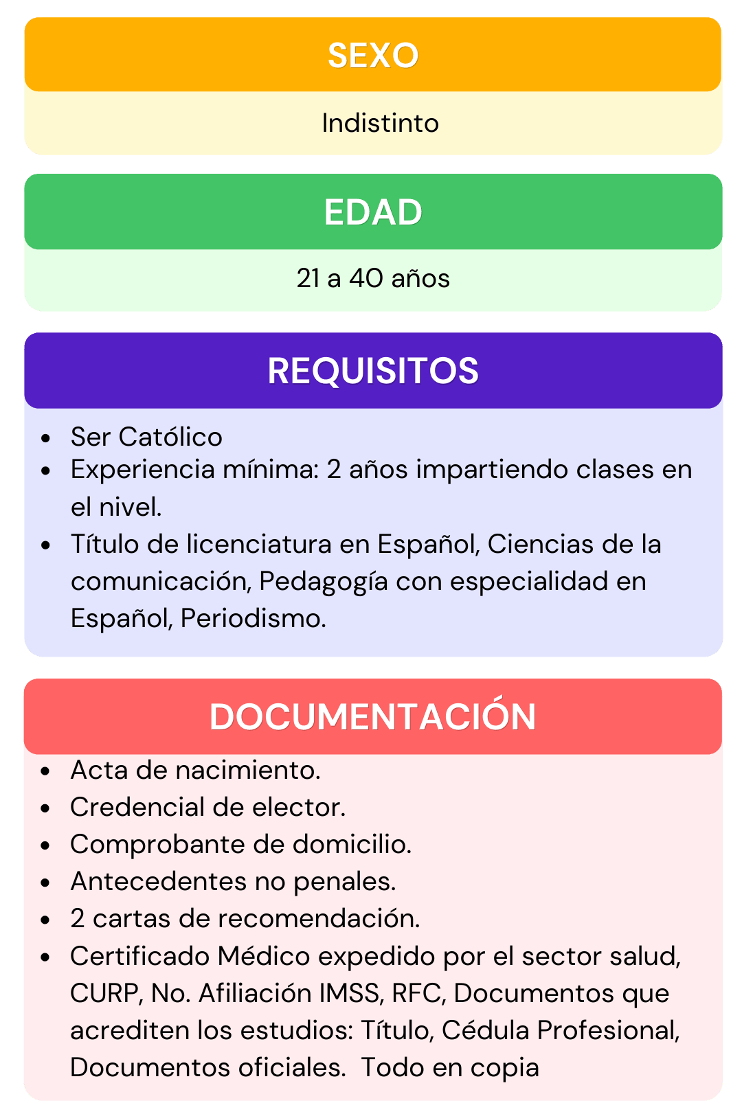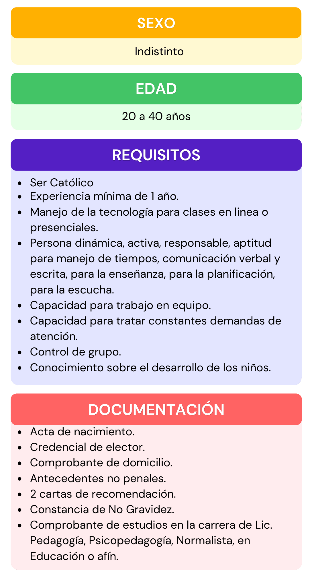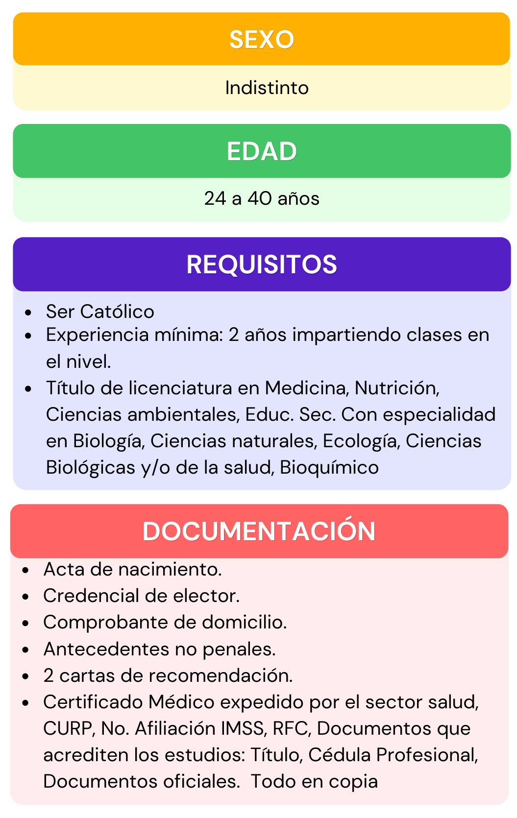 Si deseas formar parte del personal que labora en nuestra institución, selecciona el área de interés para la cual te gustaría aplicar, da click en ver requisitos ahí encontraras todos los requisitos que se ocupan para el puesto seleccionado, después abre el chat que se encuentra en la parte inferior izquierda, escribe el puesto de interés y rellena los datos que se te piden, por ultimo adjunta tu currículum vitae. En caso de contar con alguna vacante nos pondremos en contacto contigo.