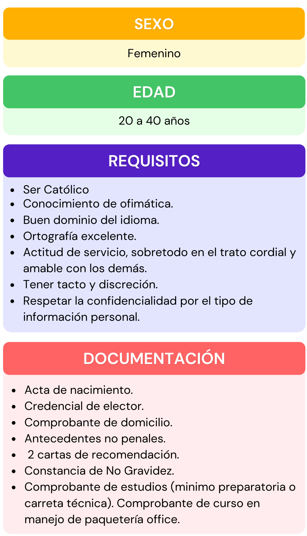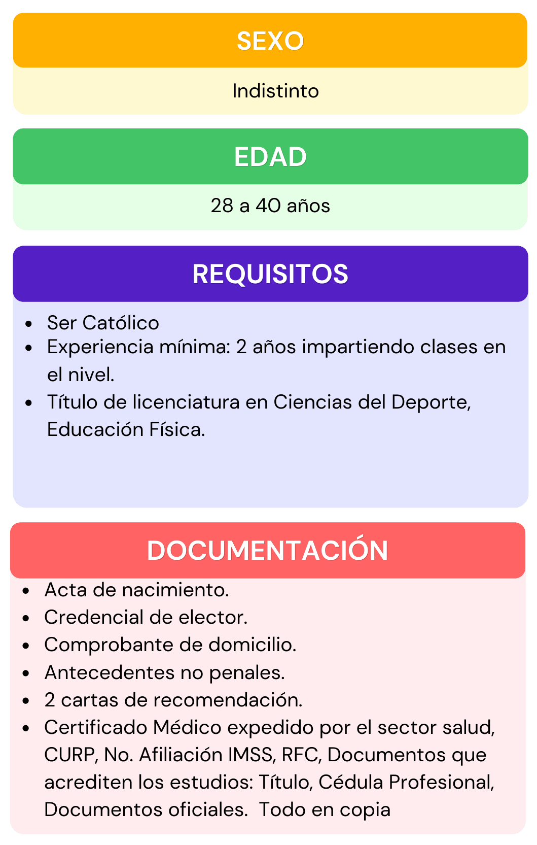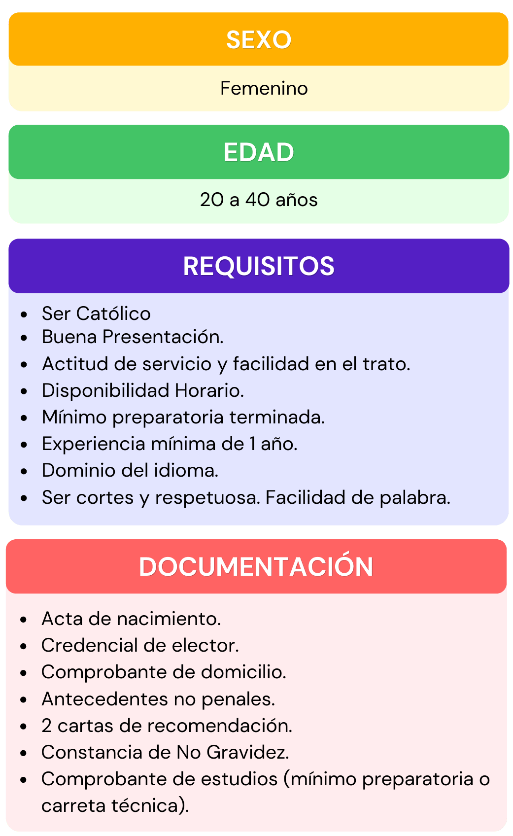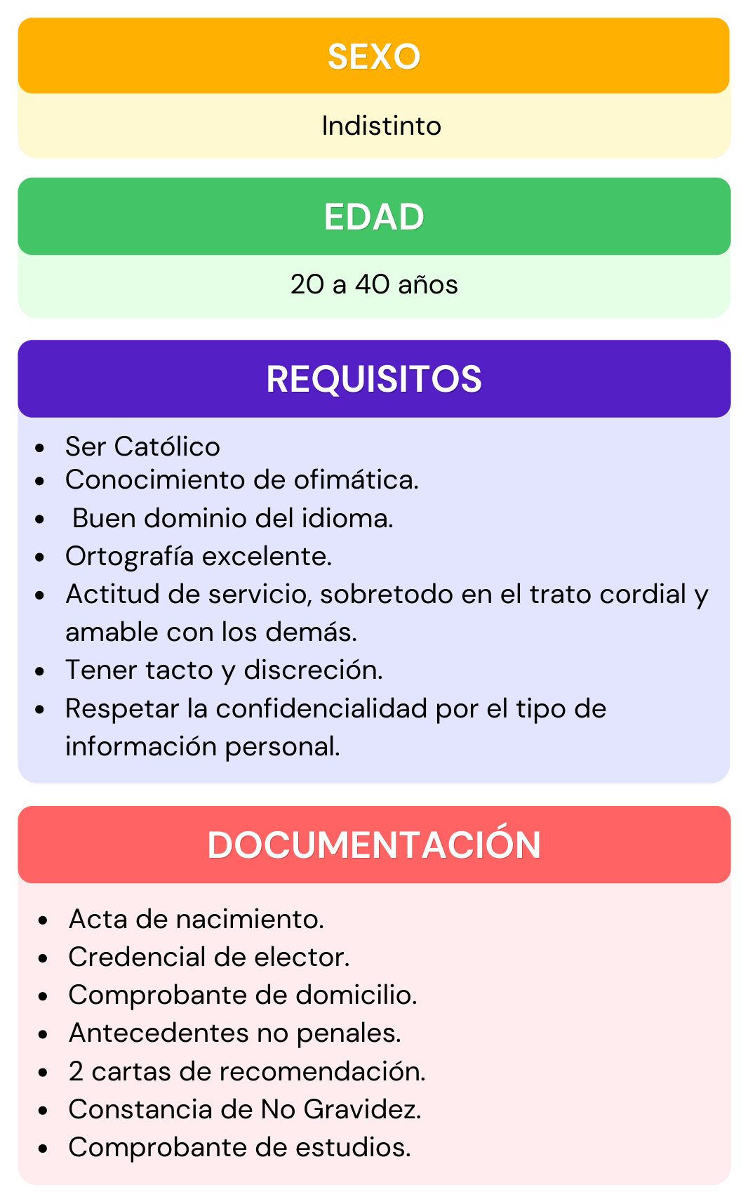 Si deseas formar parte del personal que labora en nuestra institución, selecciona el área de interés para la cual te gustaría aplicar, da click en ver requisitos ahí encontraras todos los requisitos que se ocupan para el puesto seleccionado, después abre el chat que se encuentra en la parte inferior izquierda, escribe el puesto de interés y rellena los datos que se te piden, por ultimo adjunta tu currículum vitae. En caso de contar con alguna vacante nos pondremos en contacto contigo.